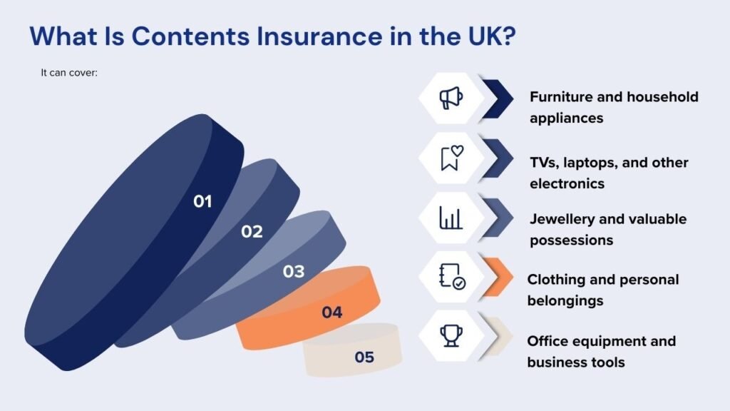 Contents insurance covers the belongings inside your home, including furniture, electronics, personal items, and certain types of flooring, such as carpets. It helps protect your finances if your possessions are damaged, lost, or stolen due to events such as fire, theft, flooding, or accidental damage.